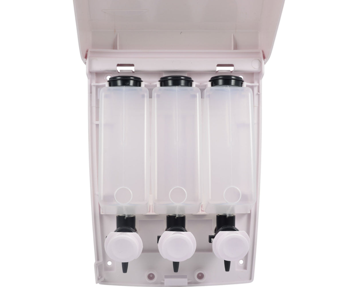This classic looking soap dispenser is not only practical but it's attractive and convenient for storing up to three different shower soaps, shampoos, conditioners, and lotions. This will keep your shower looking good and clutter-free! Easy-to-fill with a lift of the lid, and easy-to-install with silicone two-way tape, or screws. (Both included)